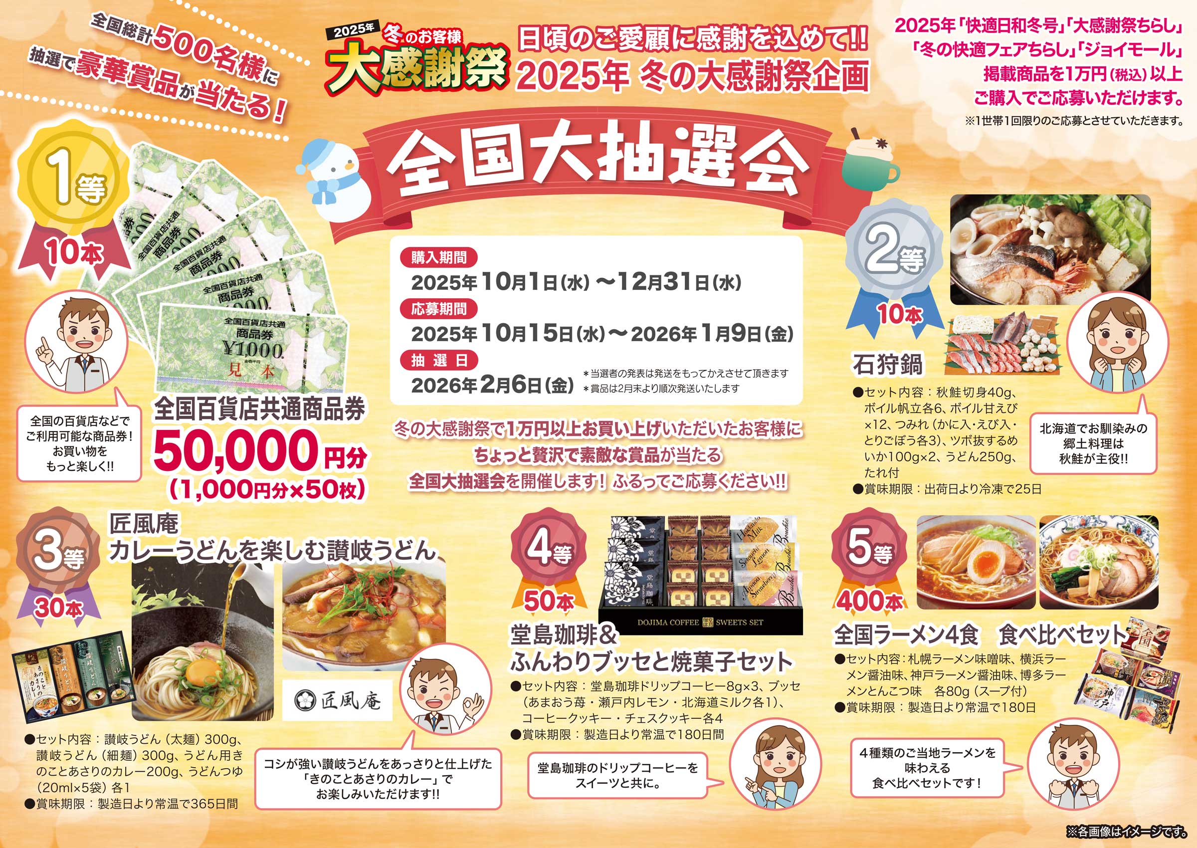 2025年「快適日和冬号」「大感謝祭ちらし」「冬の快適フェアちらし」「ジョイモール」掲載商品を1万円(税込)以上ご購入で、全国百貨店共通商品券5万円分などの豪華賞品が当たる『全国大抽選会』にご応募いただけます。